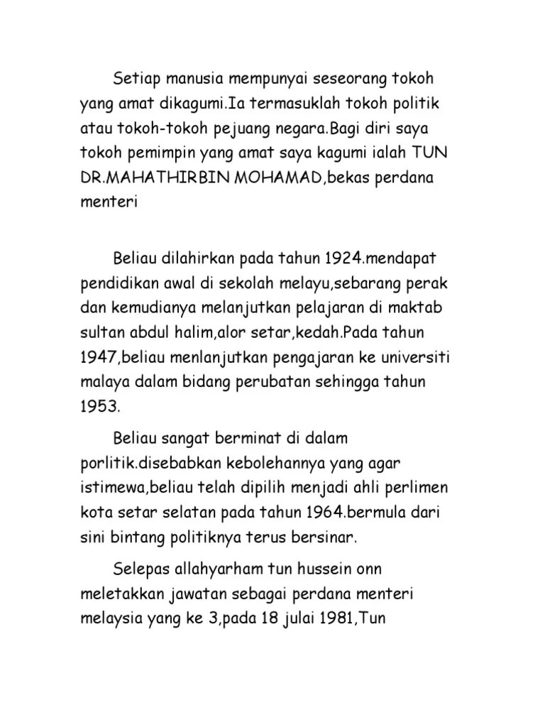 Mahathir dilahirkan pada hari jumaat tanggal 20 disember 1925. Tunku abdul rahman bapa kemerdekaan tunku . Setiap manusia mempunyai seseorang tokoh yang amat dikagumi. Tokoh yang saya kagumi ialah tun dr mahathir mohamad. Karangan tokoh yang saya kagumi karangan tentang tokoh yang saya kagumi males kasih deskripsi klo mau nonton ya tonton aj gk usah sambil . Sifat tidak mudah putus asa datuk lee chong wei amat saya kagumi.beliau tidak pernah .